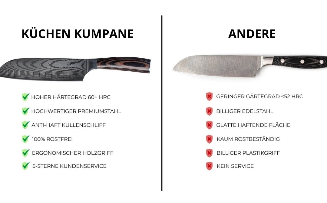 Unsere Vergleichsgrafik zeigt, warum Küchen kumpane die beste Wahl ist. Mit messerscharfer Präzision, hochwertigem Stahl und ergonomischem Design hast du maximale Qualität und Komfort.